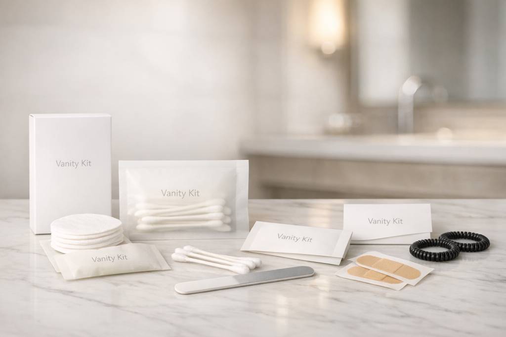 The Vanity Kit includes thoughtfully chosen essentials such as cotton pads, cotton buds, a sewing kit with needle and thread, a nail file, hair accessories, a safety pin, and a band-aid for minor cuts or little travel oops moments—all neatly packed to help guests freshen up, fix small emergencies, and feel comfortably cared for throughout their stay.